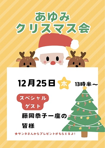 お知らせ クリスマス会🎄 お知らせ2025.12.26 今日はあゆみのクリスマス会🎄がありました。 藤岡恭子一座の皆様にお越し頂き、とても盛り上げてくださいました! 利用者様も喜ばれとても素敵な1日になりました🎅 « Previous 一覧へ Next »